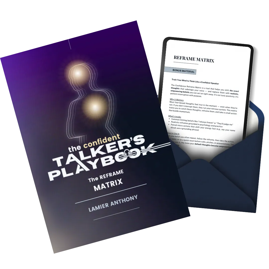 A step-by-step guide with calming resets, voice-steadying tools, and quick mental reframes to help anxious speakers feel clear, grounded, and in control—even in real-time, high-pressure conversations.